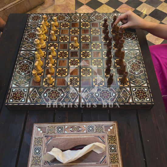 لوح شطرنج وطاولة زهر دمشقية، تحف يدوية من غابي الدايه، موزاييك دمشقي بالصدف، فنون سورية تقليدية، هدايا فاخرة تراثية، ألعاب استراتيجية فنية، قطعة فنية شرقية، طاولة زهر خشبية مطعمة بالصدف