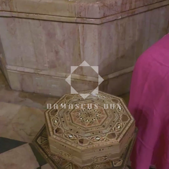 Diese elegante achteckige Damaszener Box verkörpert die Präzision und Schönheit traditioneller Holzkunst.