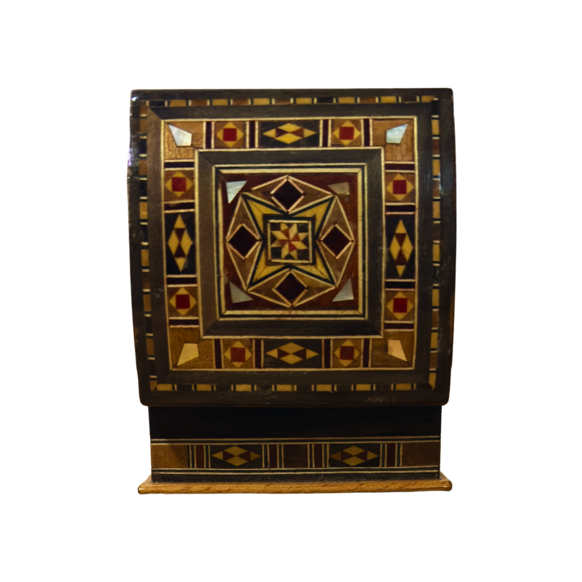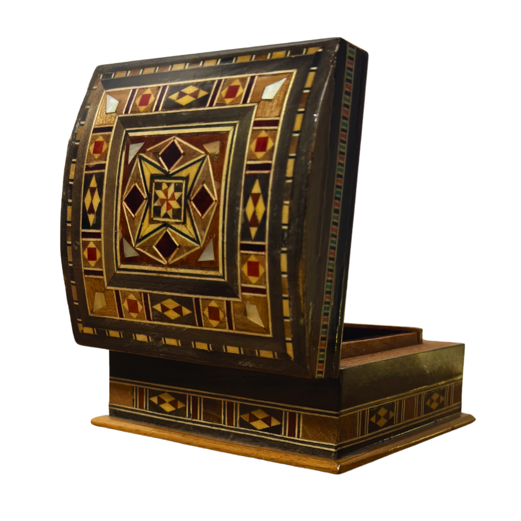 Diese Mosaik-Schatulle steht für die traditionsreiche Mosaikkunst aus Damaskus, bekannt für präzise geometrische Muster und die harmonische Kombination edler Hölzer. Jede Schatulle wird sorgfältig von Hand gefertigt.