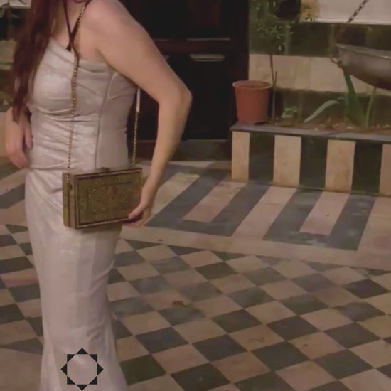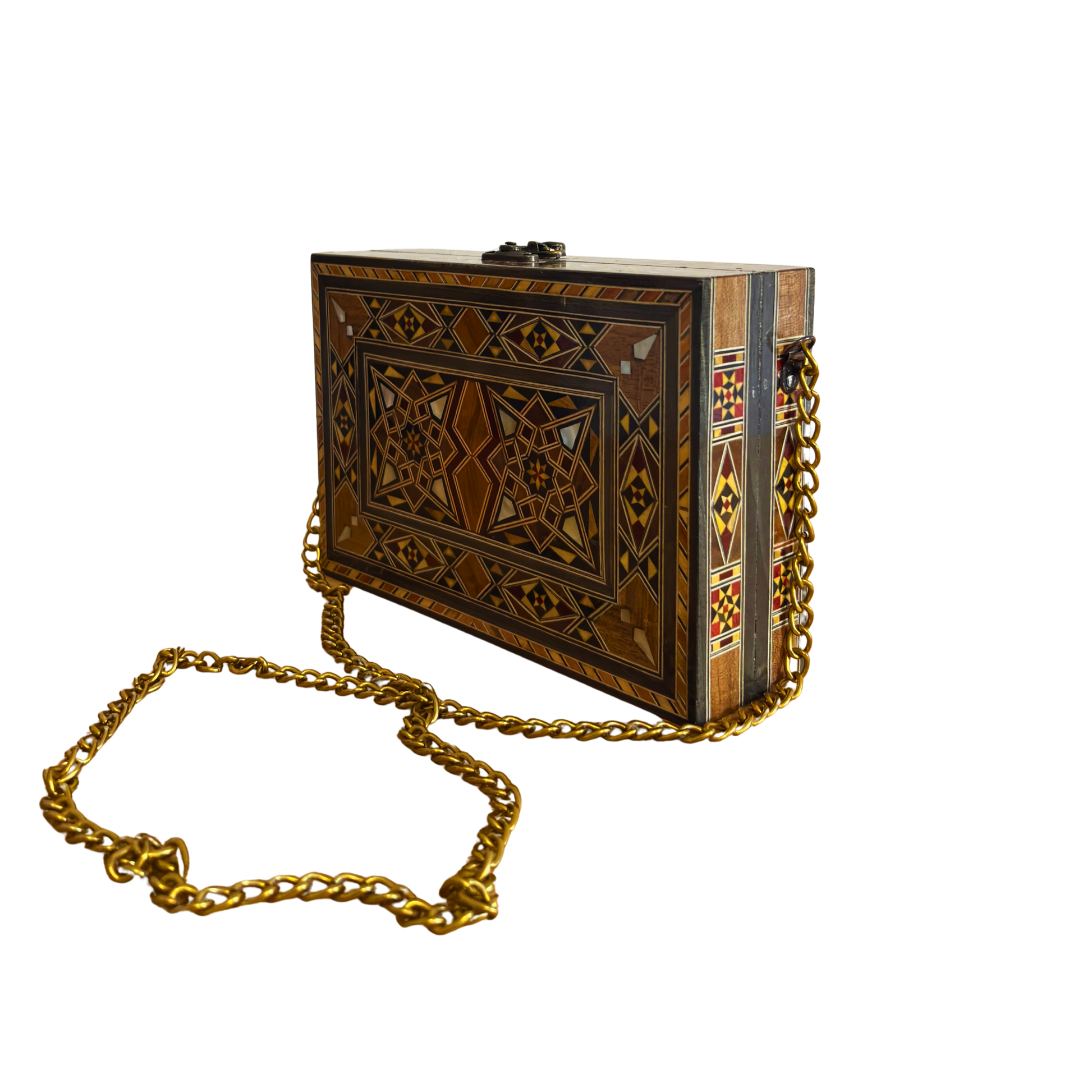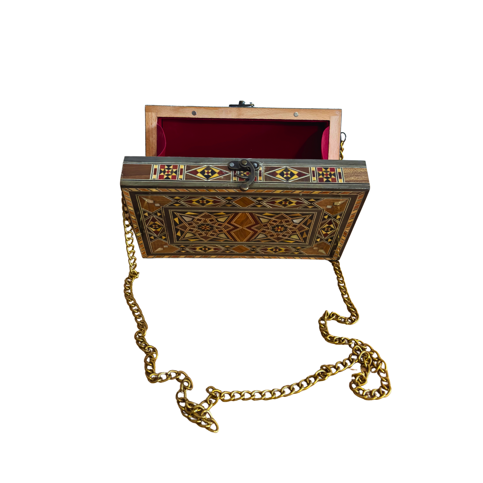borsa damaschina, madreperla, arte orientale, artigianato siriano, borsa di legno, catena dorata, borsa da sera, Damascus Box