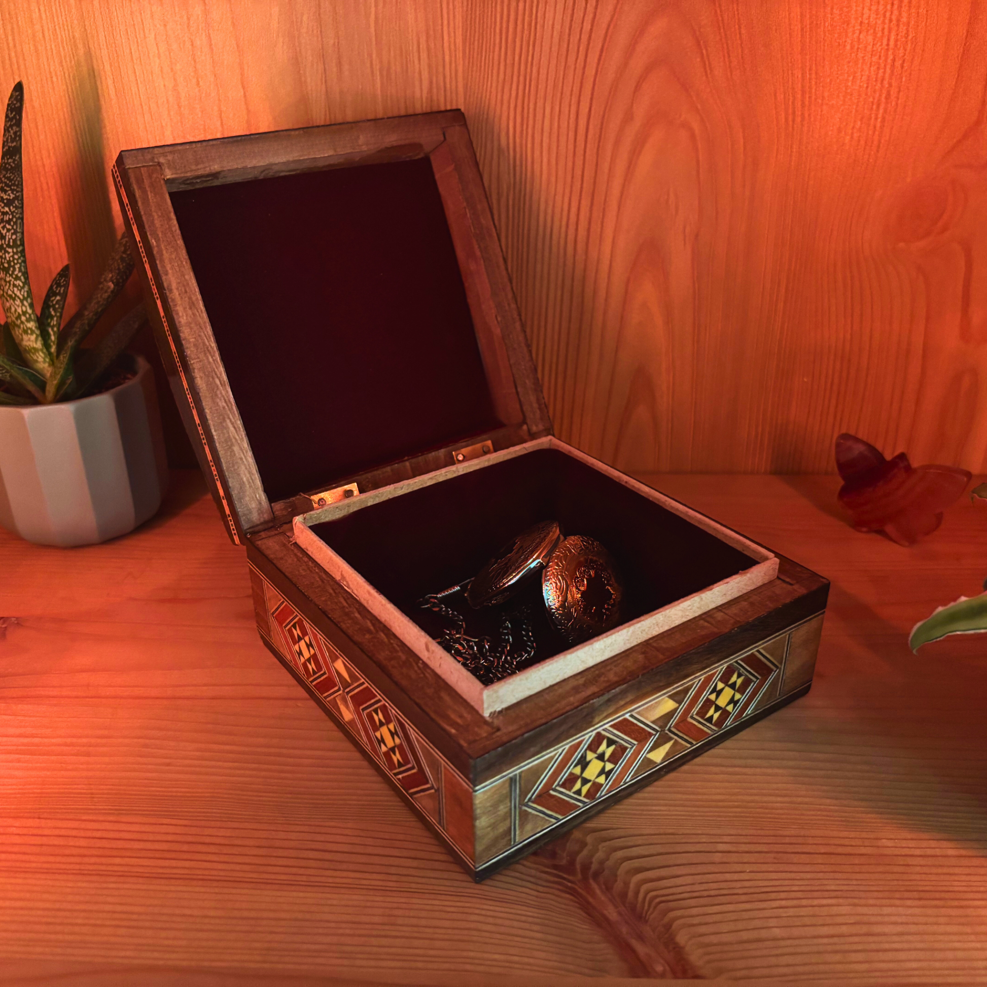 Questo portagioie in mosaico damascato fatto a mano è una splendida fusione di tradizione mediorientale e artigianato senza tempo. Realizzato in legno naturale di faggio e noce , e decorato con intricati intarsi a mosaico e madreperla , è un pezzo che unisce funzionalità e arte culturale.