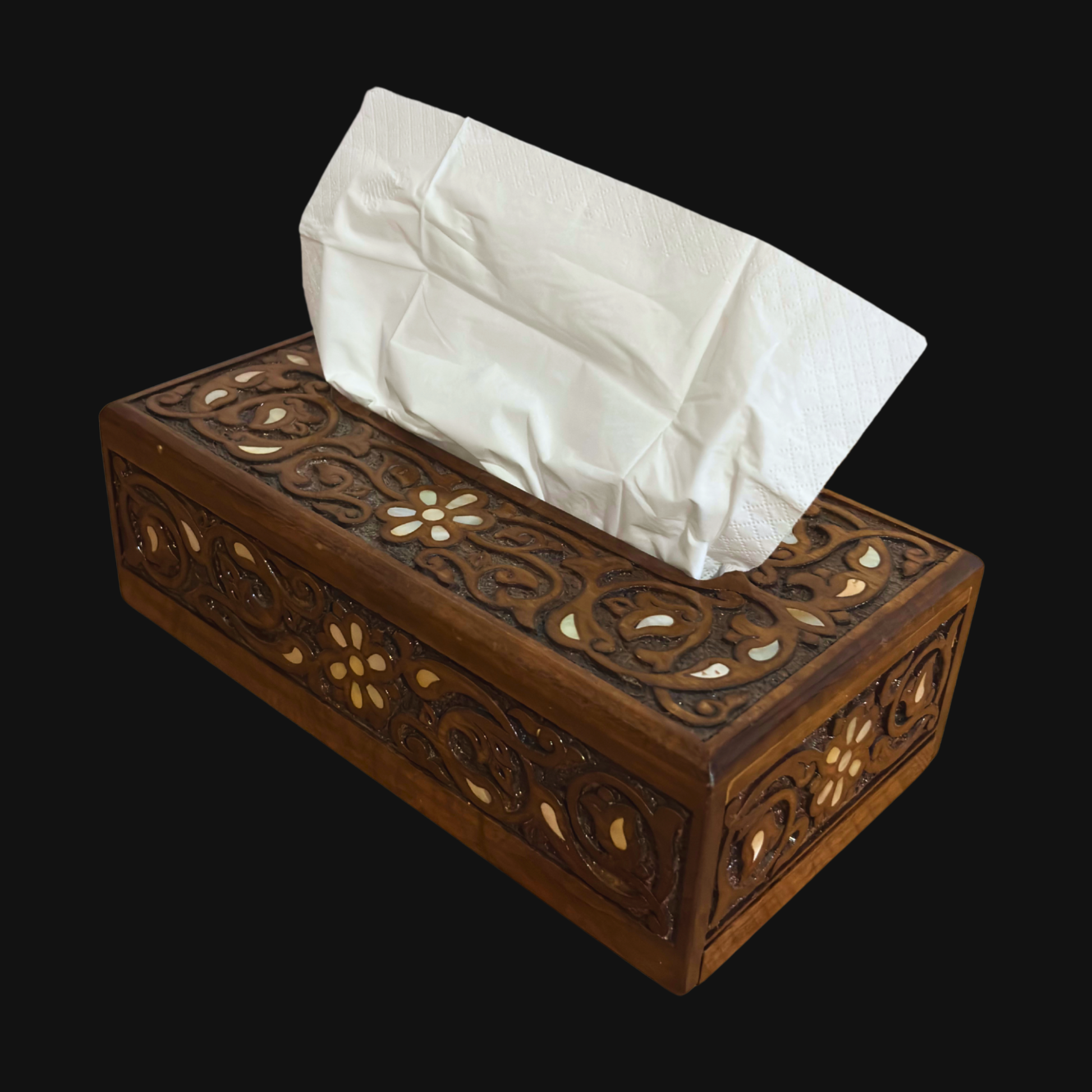 Porta Fazzoletti in Faggio Intagliato a Mano – Finitura Noce con Madreperla