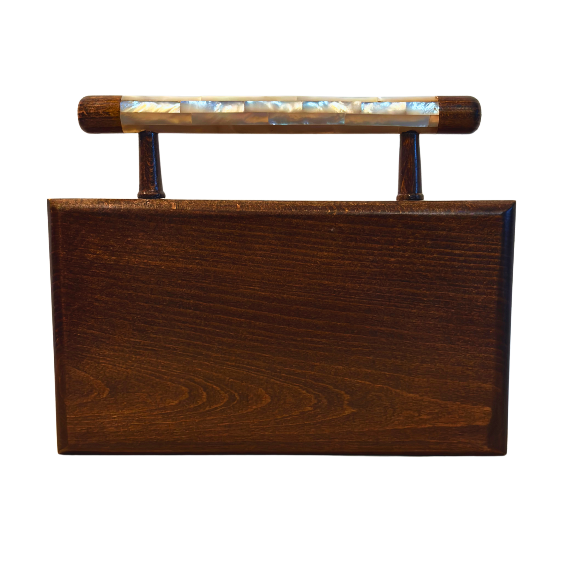 Damascener clutch, parelmoer, bloemenpatroon, notenhout, brokaat, handgemaakt, Damascus Box