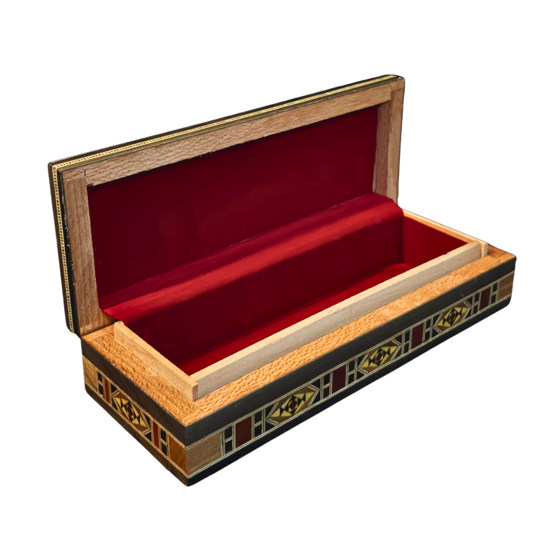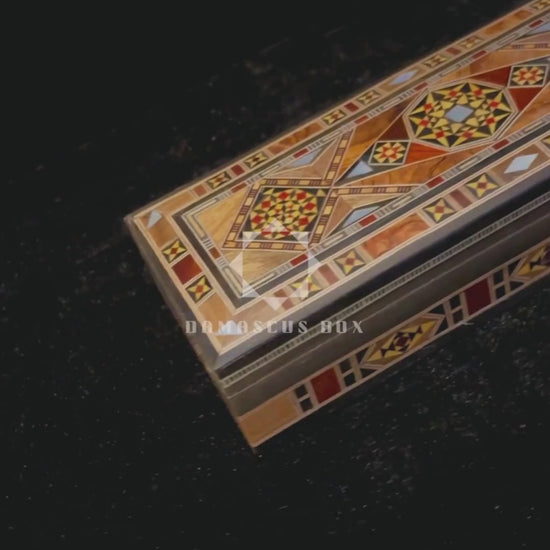 Trefwoorden: damasceense houten doos, langwerpige sieradendoos, parelmoer pennendoos, Syrische mozaïekdoos, oosterse kunst, handgemaakt geschenk, houten opbergdoos, doos uit Damascus, Syrische doos, cadeau voor haar, cadeau voor hem