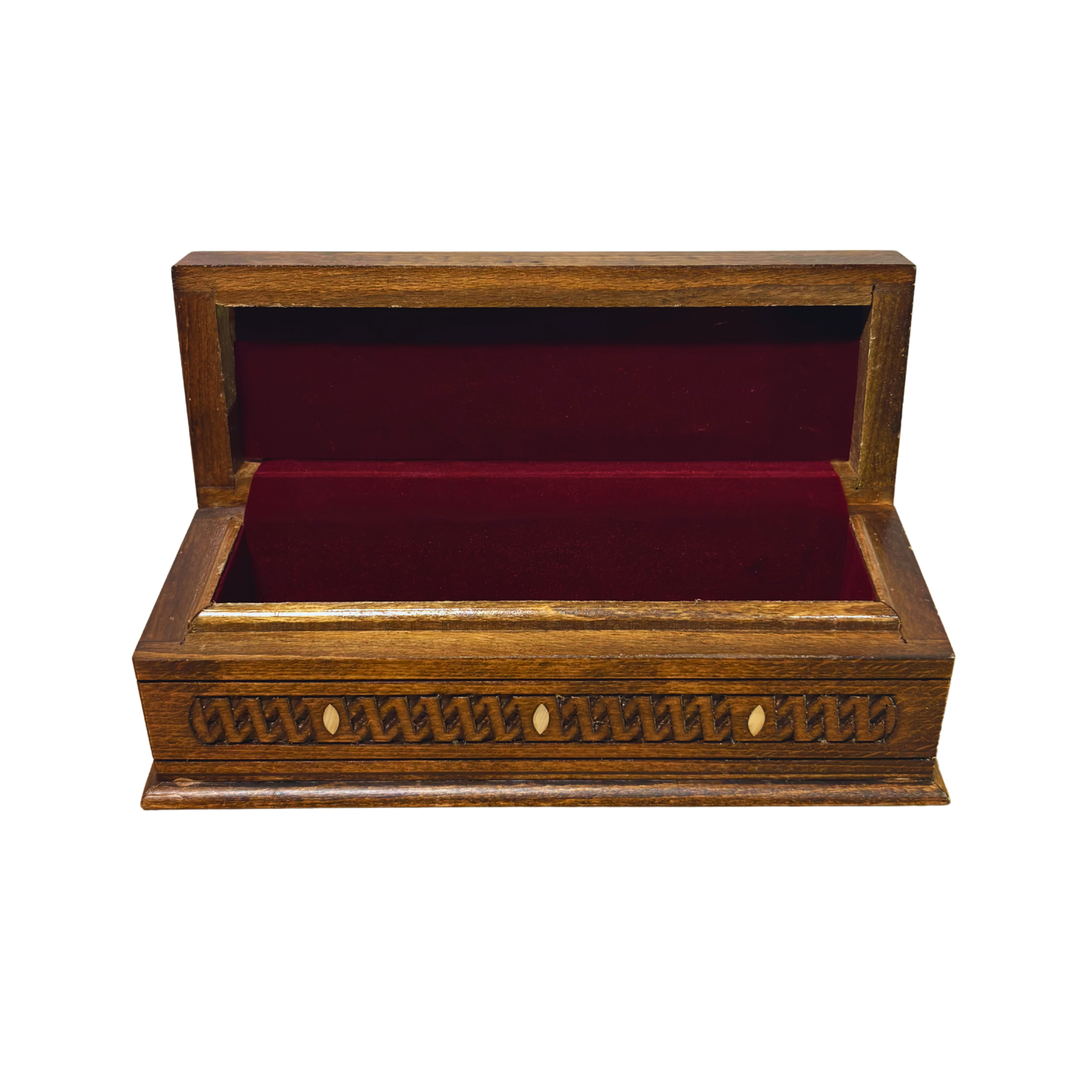 Wykończenie w ciemnym orzechu oraz aksamitne wnętrze czynią ją idealną do przechowywania biżuterii, piór lub różańców.