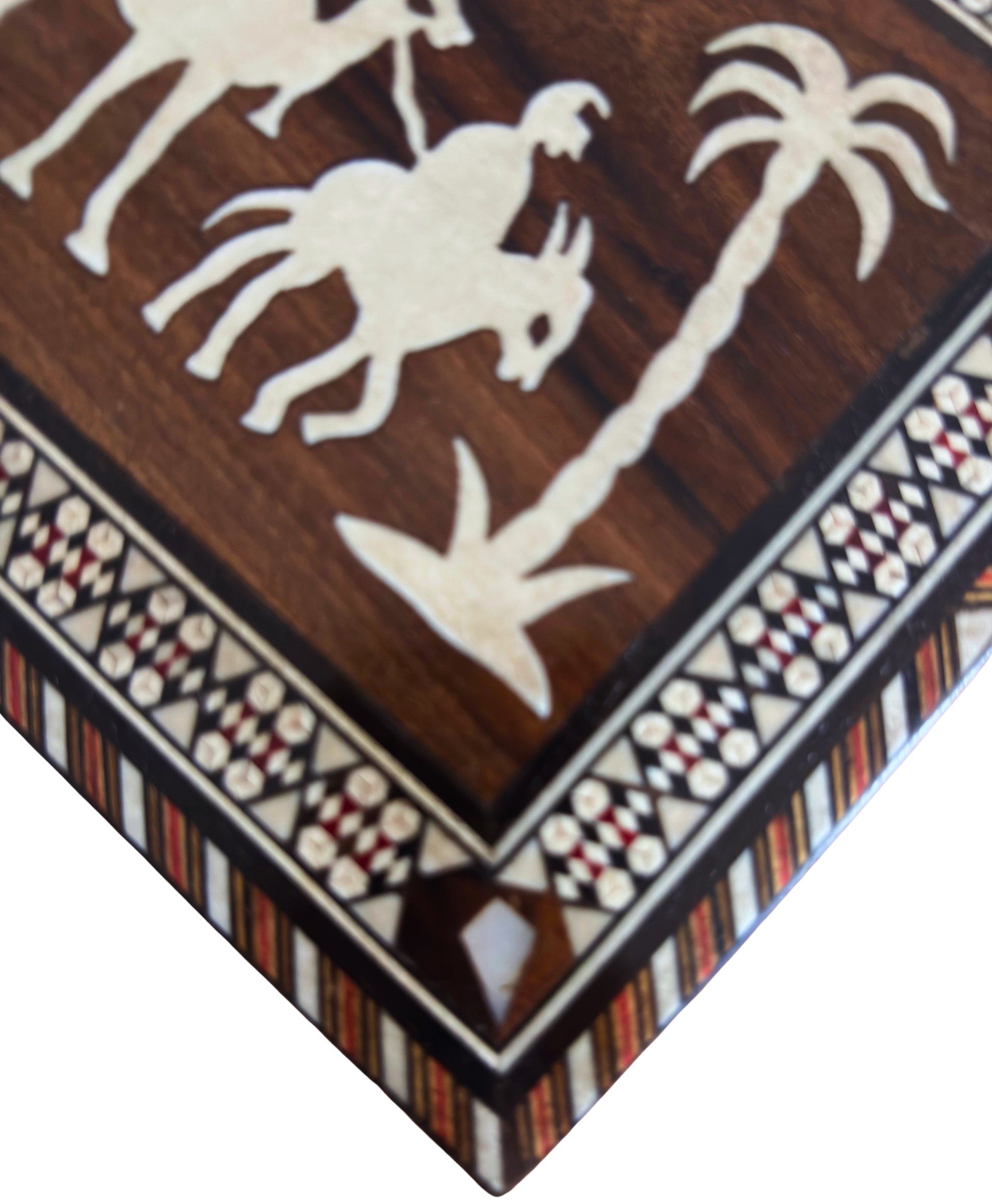 vintage pudełko mozaikowe z wielbłądami, 1970 drewniane pudełko Damascene, ręcznie robione pudełko z masą perłową, beduińska scena pustynna, syryjska pamiątka mozaikowa, vintage dekoracje Bliskiego Wschodu, prezent dla niej, wyjątkowy prezent na rocznicę, ręcznie robione pudełko mozaikowe, pudełko z Damaszku, syryjskie pudełko, prezent dla niego
