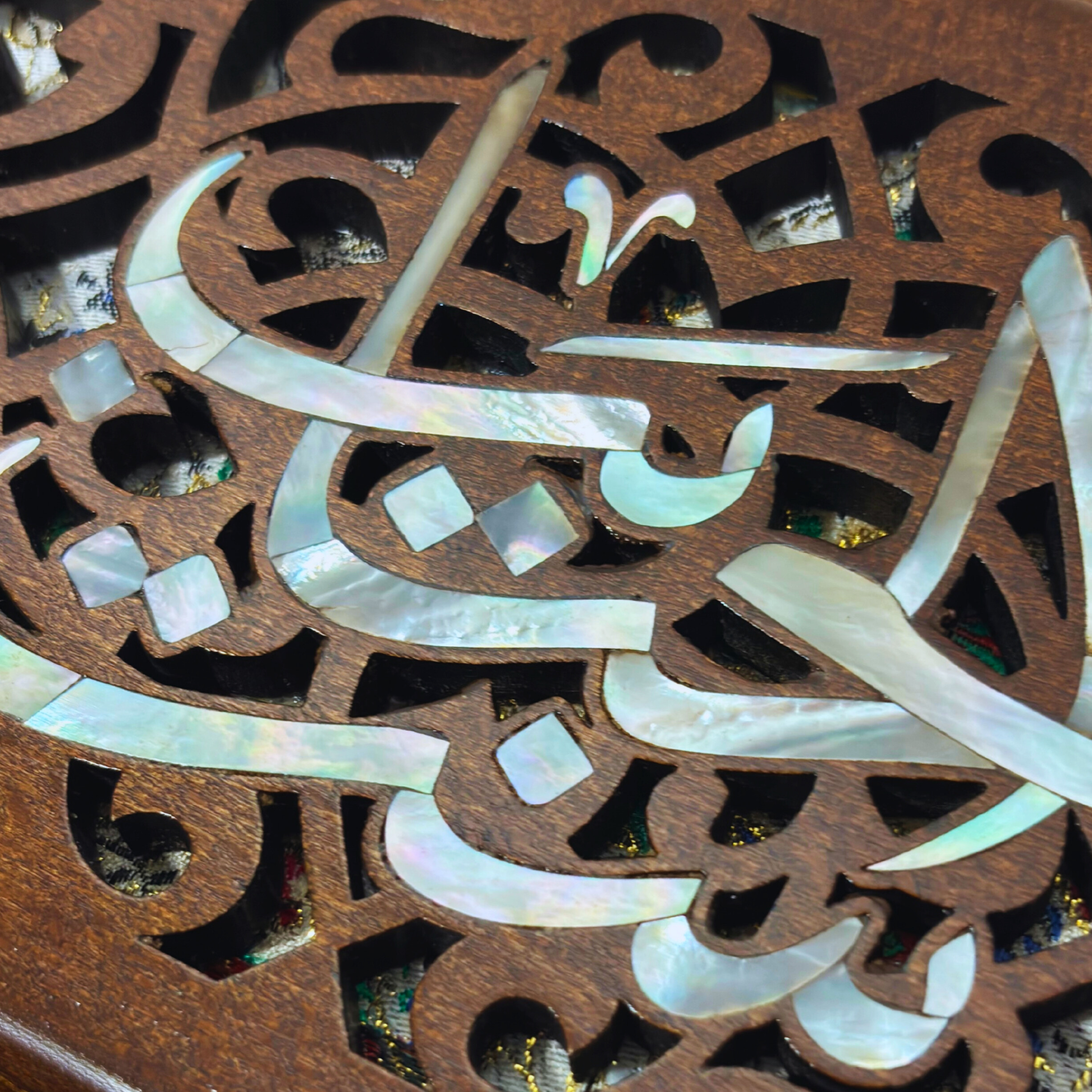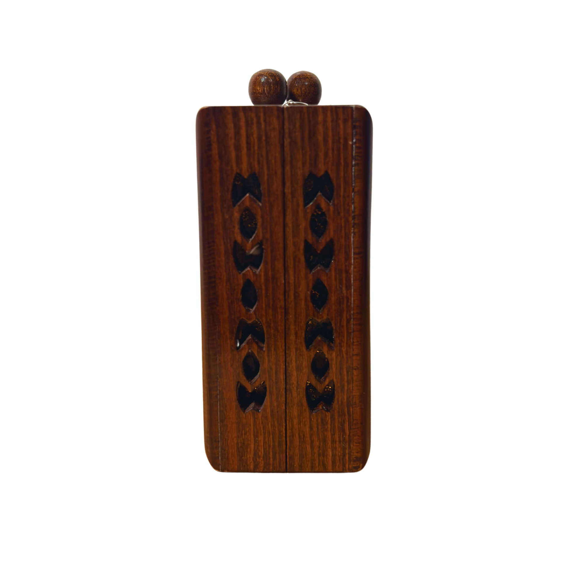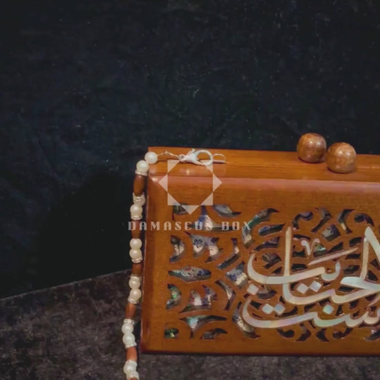 Handcrafted from fine walnut wood and adorned with luminous mother-of-pearl inlay, this clutch reflects the refined elegance of Damascene craftsmanship. A detachable rosary-style pearl chain allows the piece to be worn gracefully over the shoulder or carried as an elegant handheld clutch.