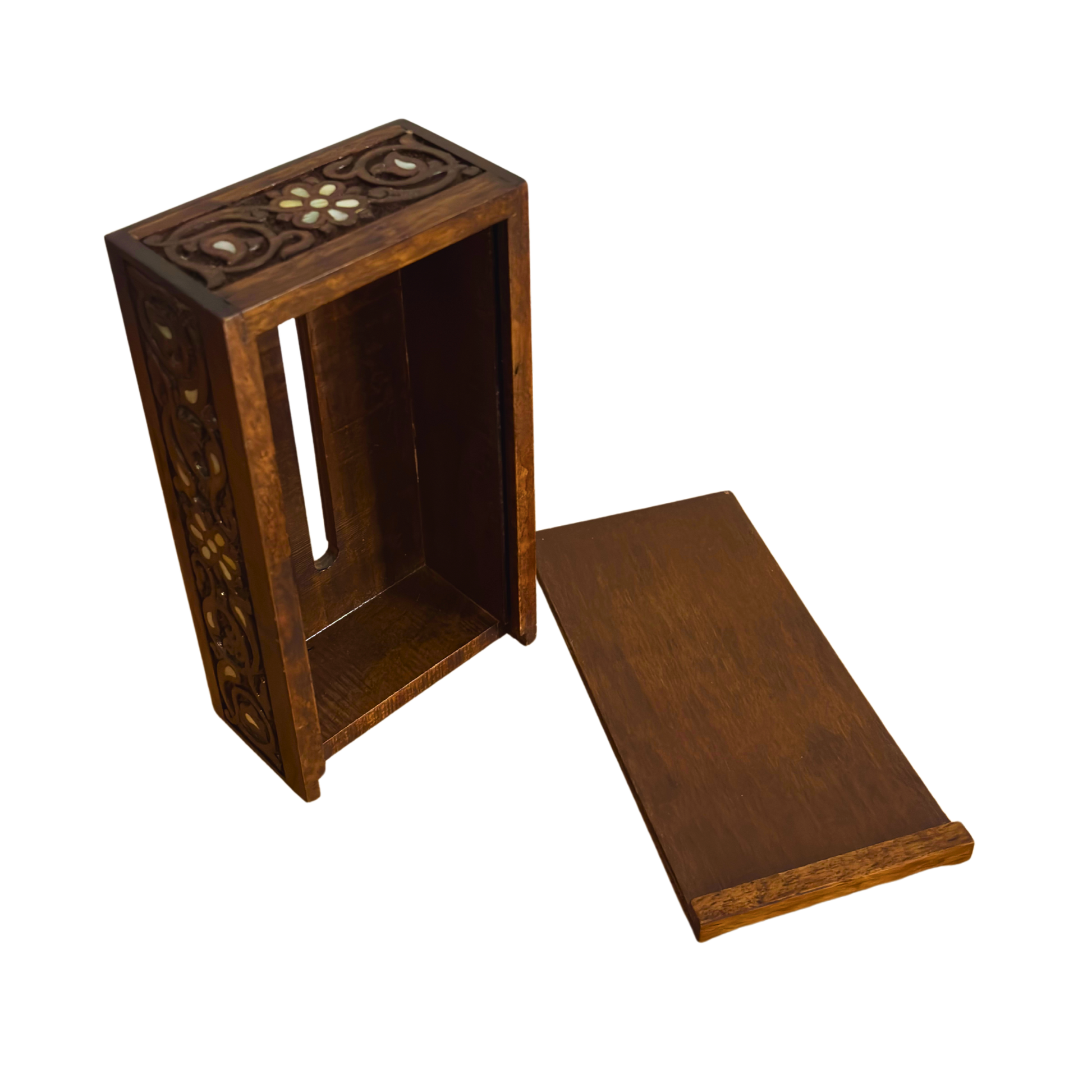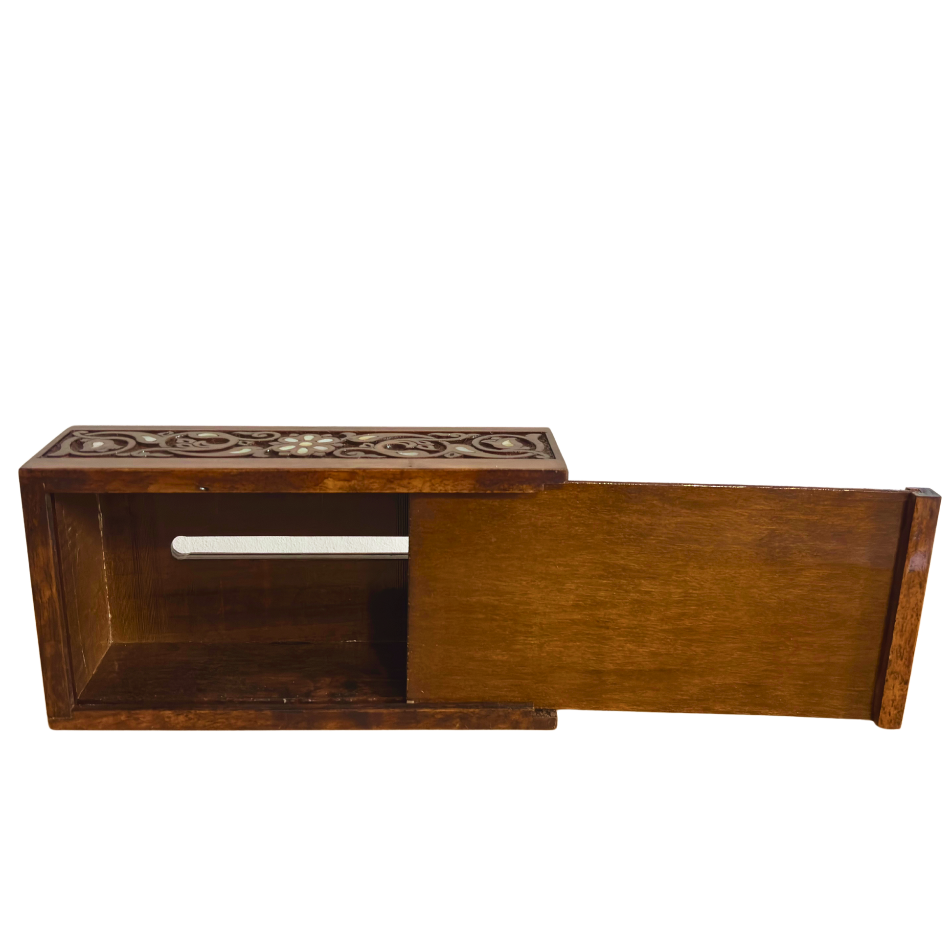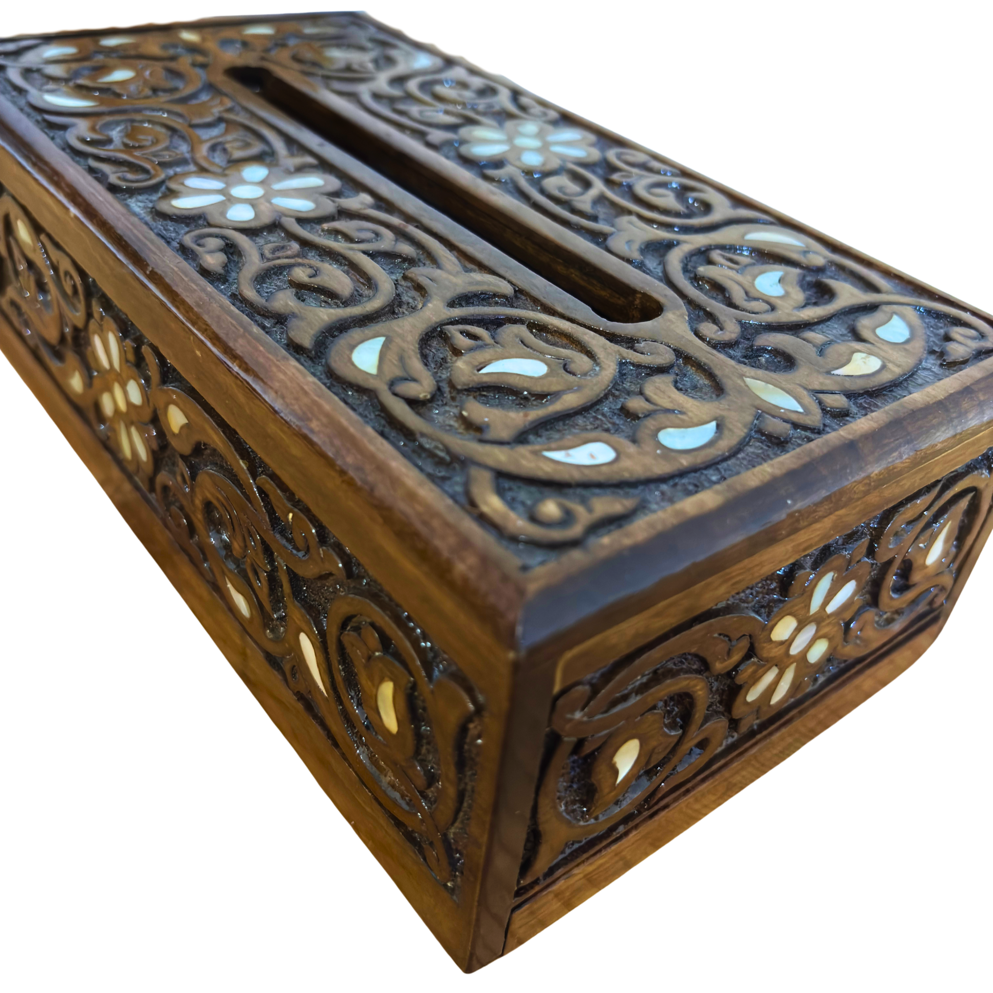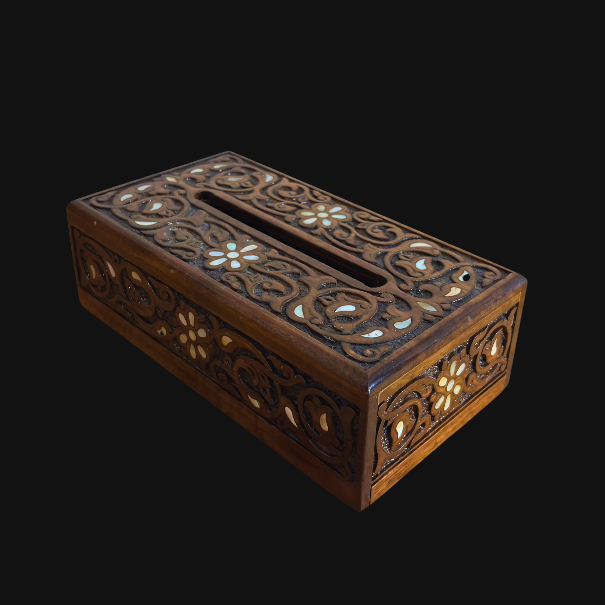 Hand-Carved Beechwood Tissue Box with Mother of Pearl Inlay – Walnut Finish Elegance
