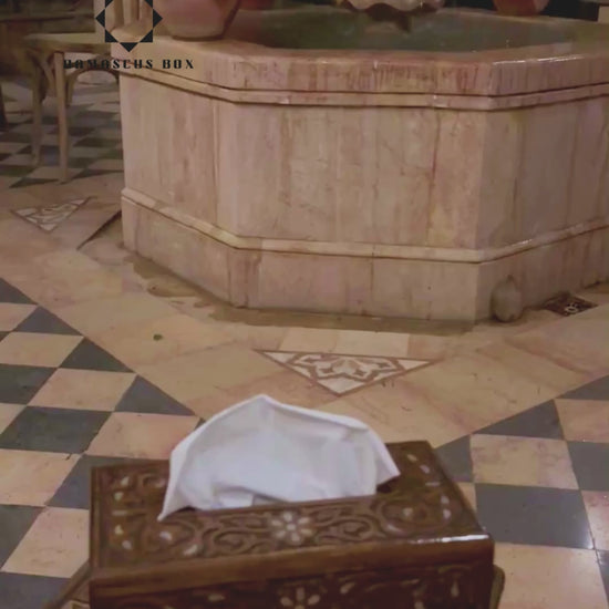 This exquisite Damascene tissue box is meticulously hand-carved from dried beechwood, finished with a rich walnut tone, and adorned with 80 delicate pieces of mother of pearl. Each element is patiently shaped and inlaid by skilled artisans, preserving the ancient Damascus mosaic tradition.