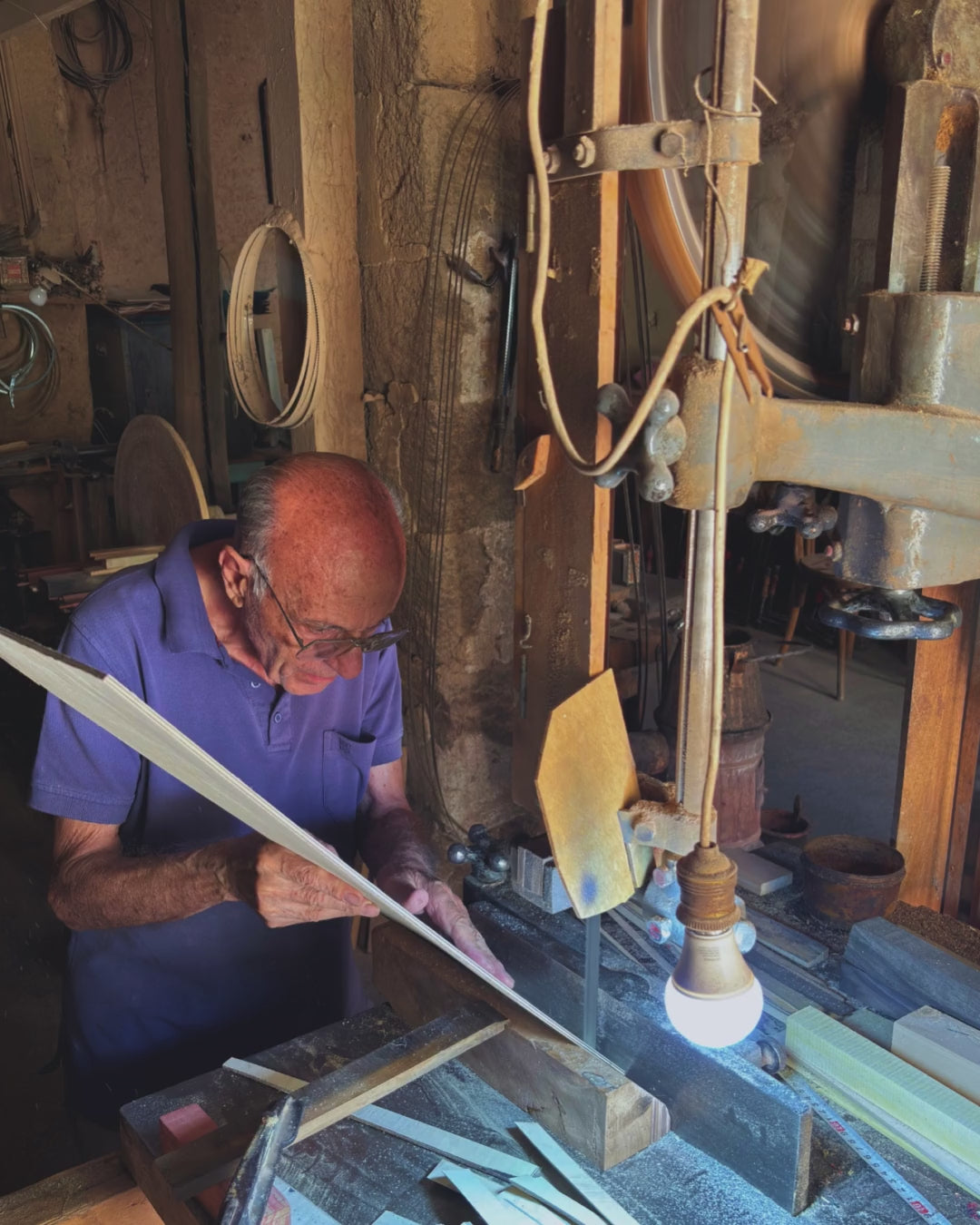 The table is meticulously handcrafted from walnut, lemon, beech, eucalyptus, and rosewood, using natural glues and adorned with authentic mother of pearl inlay. Every detail is executed using traditional Damascene mosaic techniques, passed down through generations.