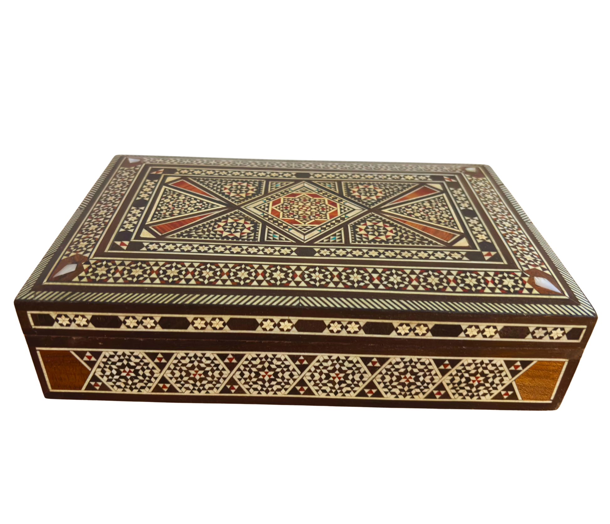 vintage Damascene mosaic box, handmade jewellery box, mother of pearl wood box, Syrian mosaic keepsake chest, oriental inlay box, 1970s vintage décor, gift for her, unique anniversary gift, handmade Middle Eastern art, wooden treasure box, Damascus box, Syrian box, gift for him