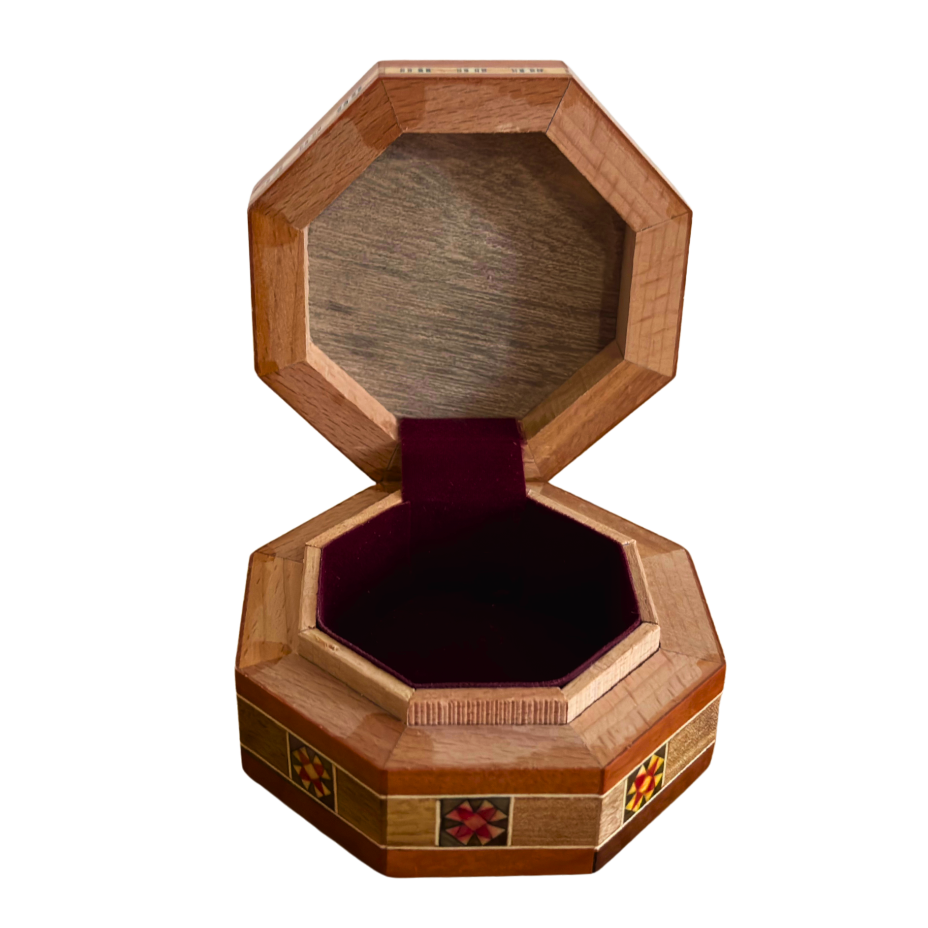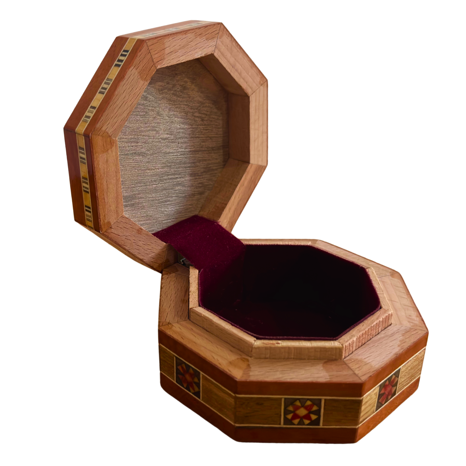 mini caixa octogonal de joias, caixa de mosaico damasceno, caixa com incrustação de madrepérola, caixa hexagonal de madeira de nogueira, pequena caixa artesanal para joias, arte de mosaico do Oriente Médio, caixa de presente artesanal, caixa vintage única, presente de madeira artesanal, caixa elegante de lembrança, caixa de Damasco, caixa síria, presente para ela, presente para ele