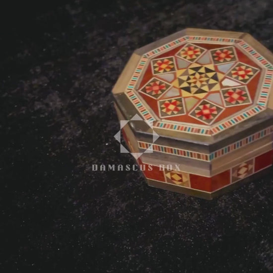 Bu mini sekizgen Damask mozaik kutu ile Orta Doğu el işçiliğinin zarafetini keşfedin. Eukaliptüs, ceviz, gül, kayın, limon ve sarı çam ağaçlarından özenle el yapımı olan kutu, parıldayan sedef kakmalarıyla süslenmiştir. Altıgen formu ve zarif geometrik desenleri, geleneksel Orta Doğu sanatını gözler önüne serer.